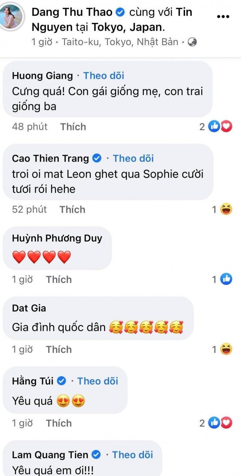 Các con của Đặng Thu Thảo ngày càng cao lớn, kháu khỉnh. Chị cả Sophie được ví von là "bản sao" hoàn hảo của mẹ, sở hữu nước da trắng ngần, gương mặt nhỏ nhắn và đôi chân dài miên man. Ở tuổi lên 4, cô bé cao ngang bụng mẹ, từng nhận nhiều lời khen ngợi sẽ trở thành một Hoa hậu trong tương lai. Trong khi đó, cậu em Liam lại "đúc khuôn" bố - doanh nhân Trung Tín, bụ bẫm, điển trai.