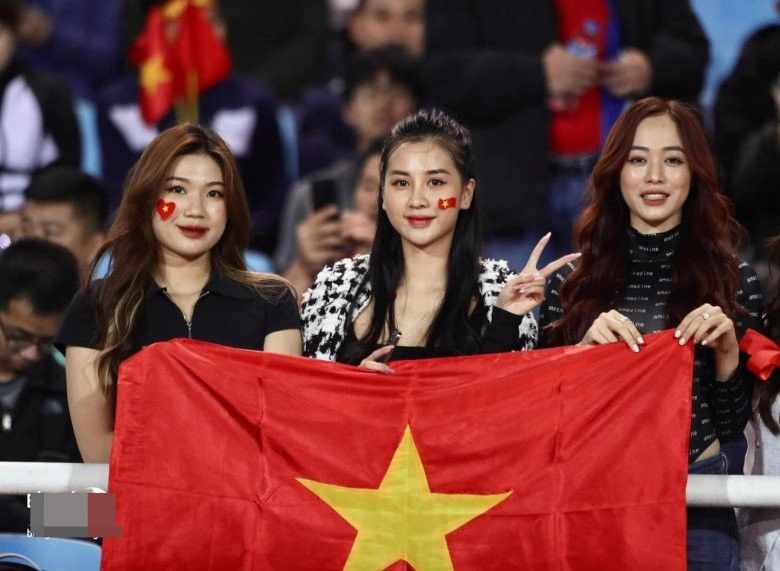 Các mỹ nhân trang điểm nhẹ nhàng, cầm theo quốc kỳ và dán đề-can trên má cổ vũ nồng nhiệt.