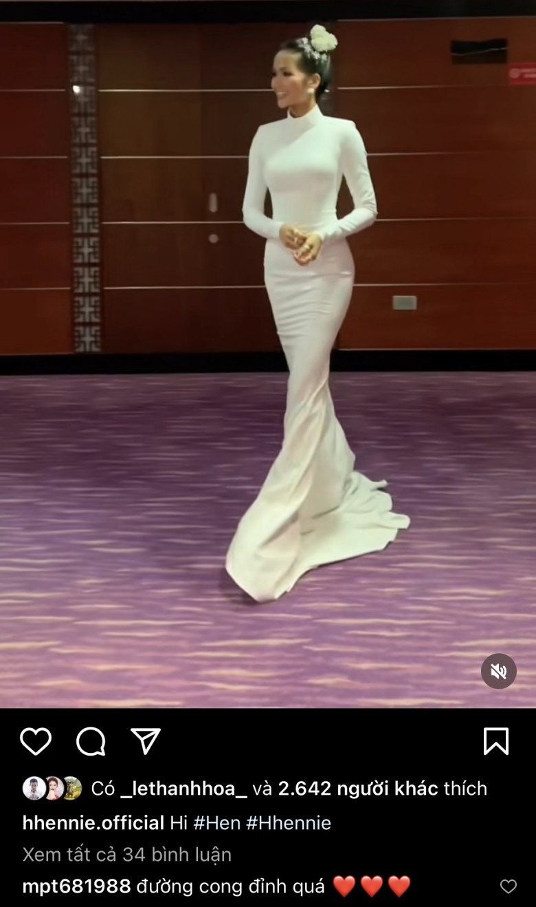 Mới đây trên trang cá nhân, H’Hen Niê khoe khéo đoạn clip sải bước tự tin với chiếc váy dạ hội ôm sát hình thể nuột nà và săn chắc trong một sự kiện tại Hà Nội. Ngay lập tức đàn chị của cô là Mai Phương Thuý để lại bình luận ngưỡng mộ đàn em: “Đường cong đỉnh quá”.