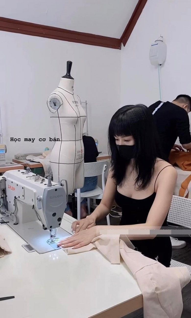 Cô nàng sở hữu mái tóc màu đen tự nhiên cùng làn da trắng ngần đang chăm chú học may cơ bản.