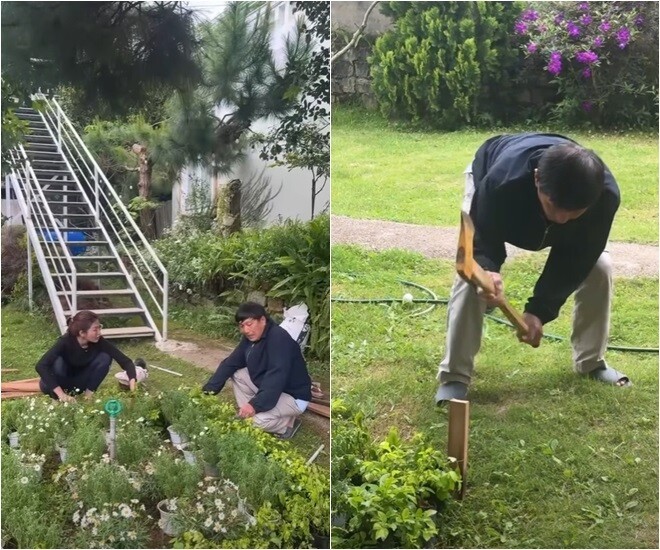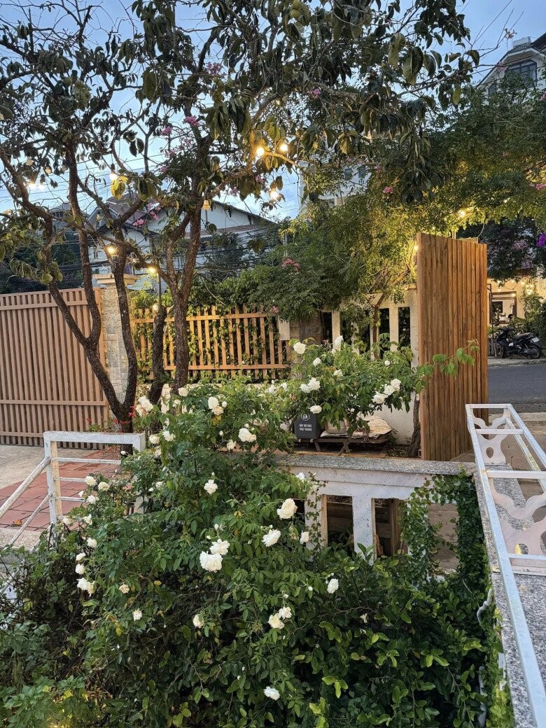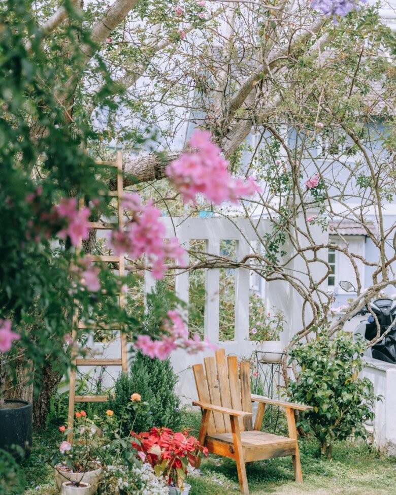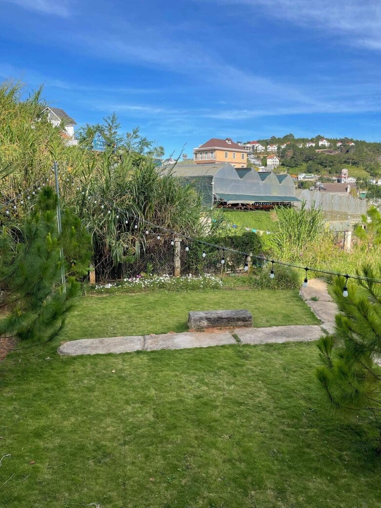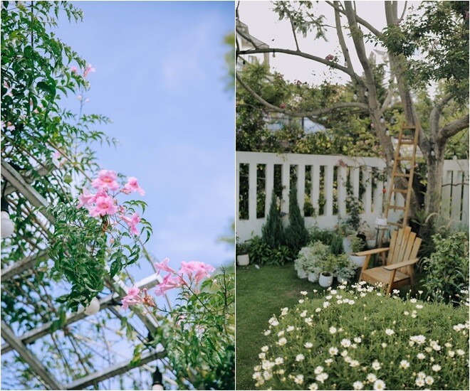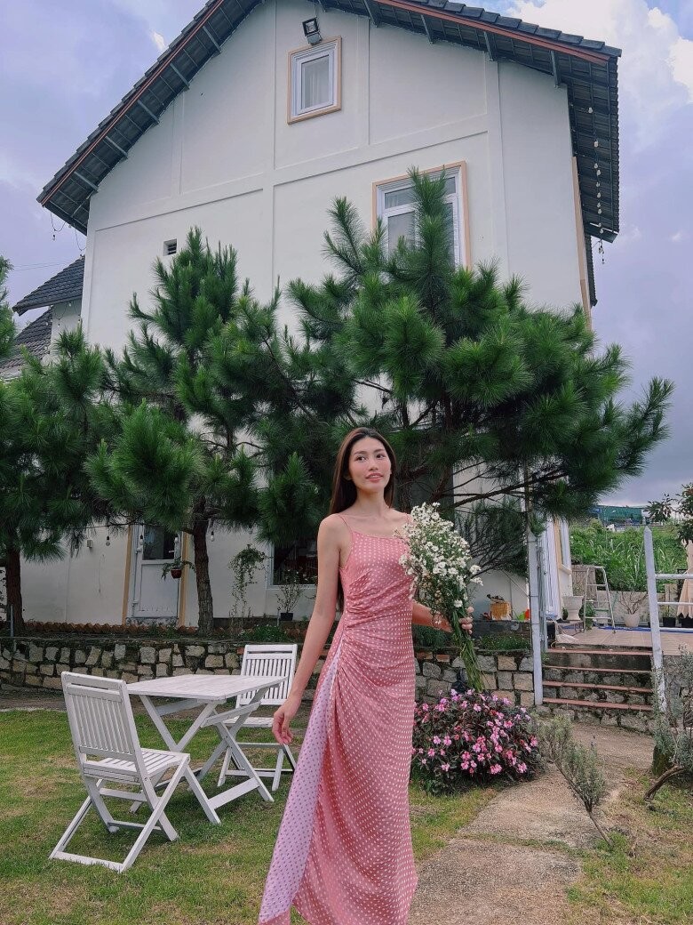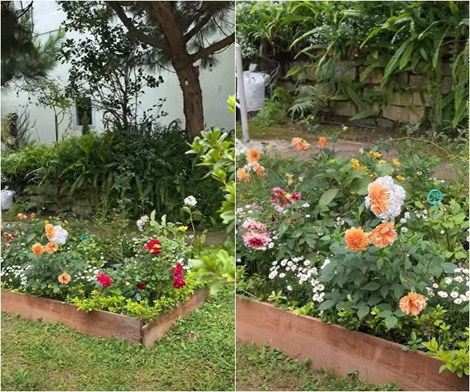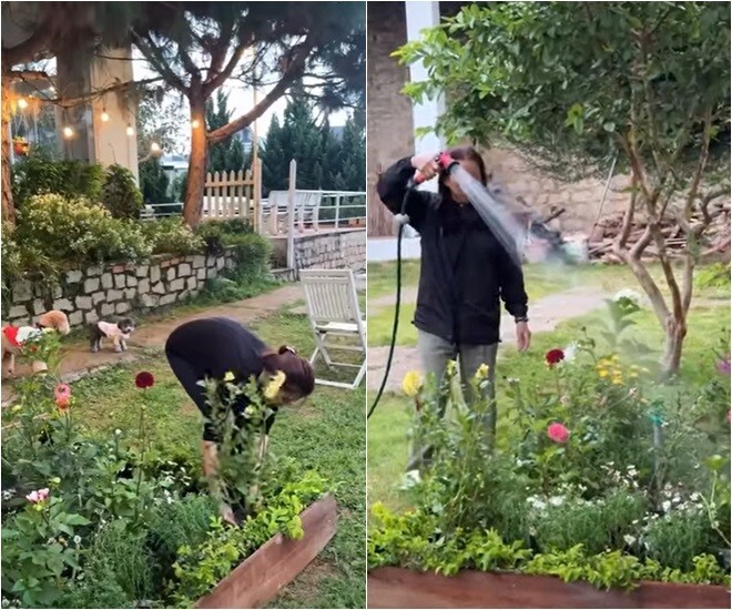 Ngôi nhà nằm trên một quả đồi nhỏ, bao quanh là thông, hoa và bãi cỏ xanh, mang lại cảm giác tĩnh tại, trong trẻo - đúng chất cao nguyên. Không gian này không cầu kỳ mà ghi điểm nhờ sự tinh giản, ấm cúng và gần gũi với thiên nhiên. Cách đây không lâu, nàng hậu khoe cảnh cùng bố mình giản dị cải tạo lại khu vườn xinh xinh.