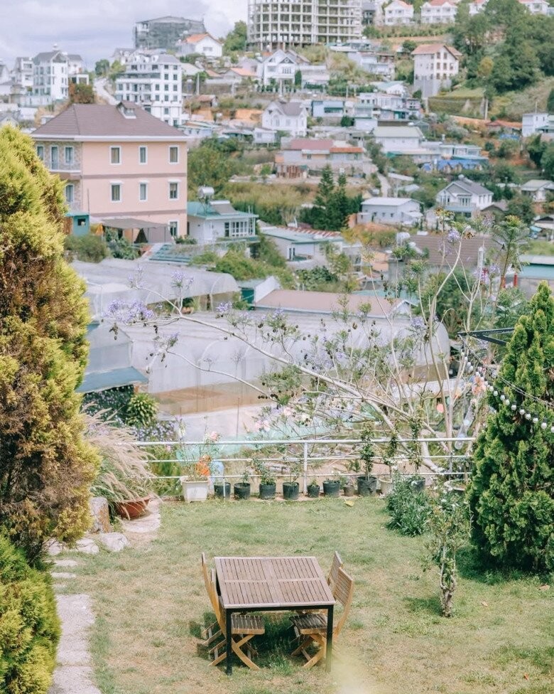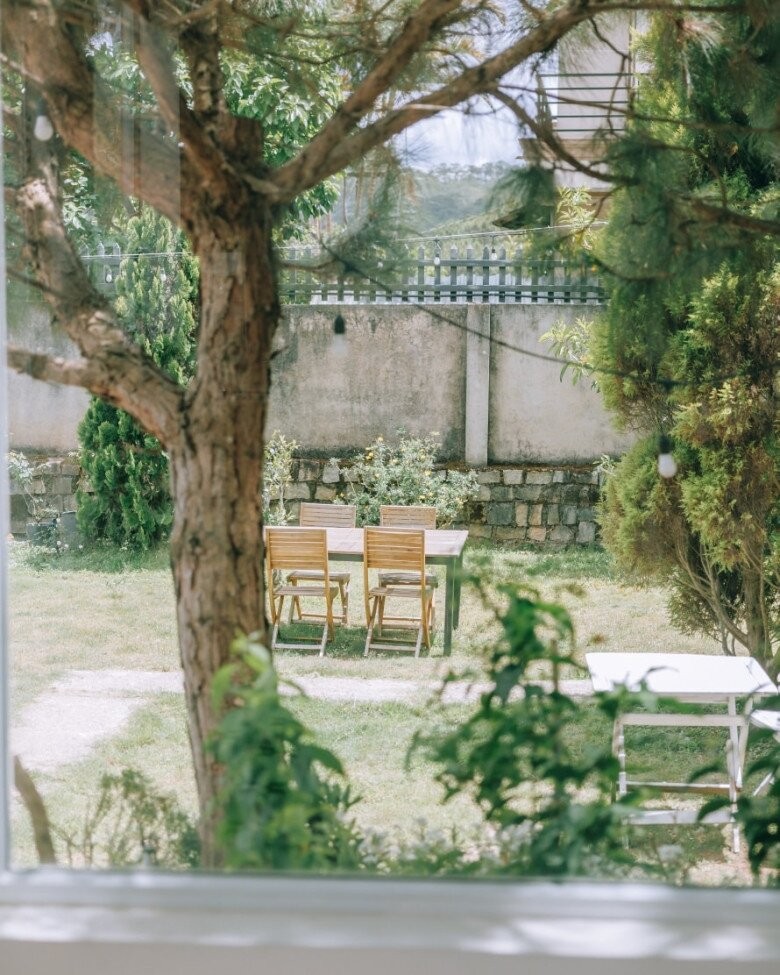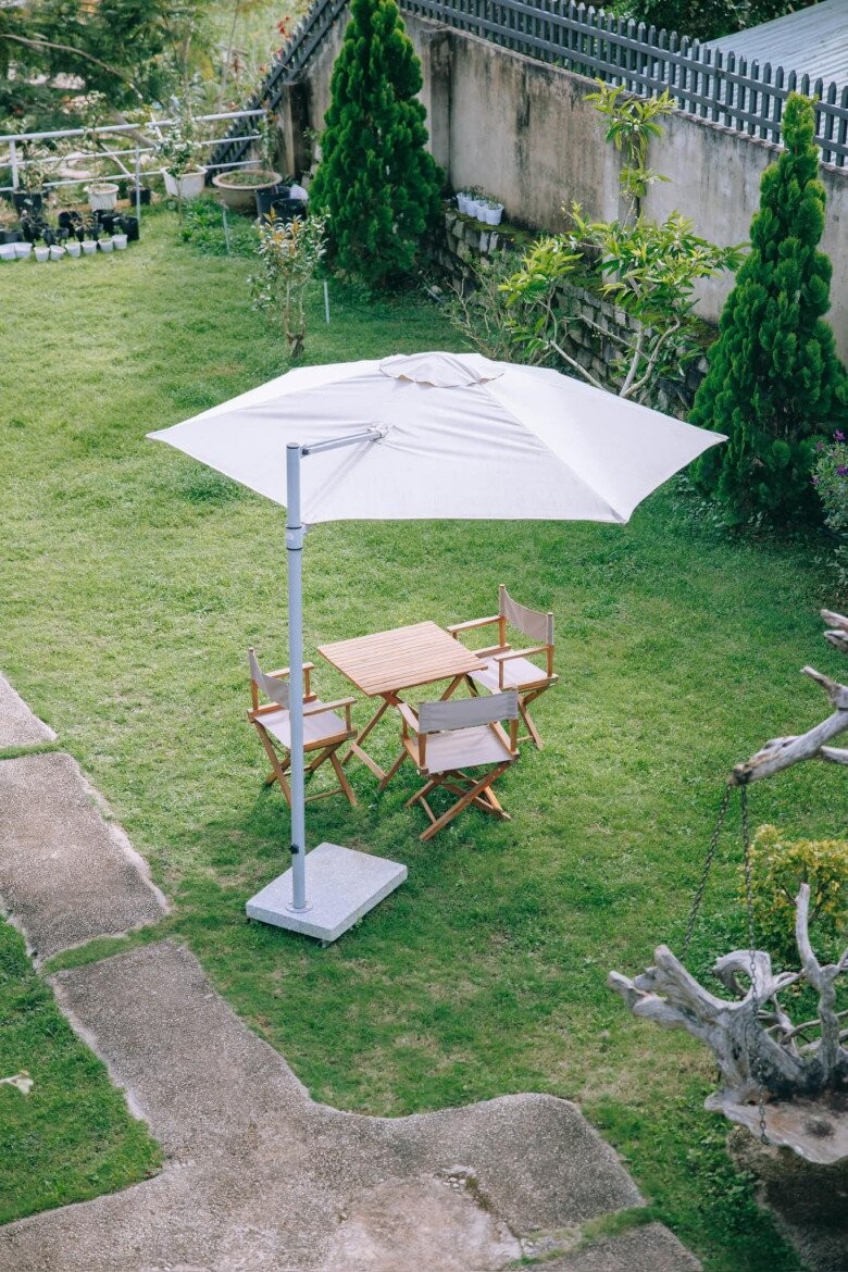 Khu ngồi uống trà ngoài trời được bố trí bộ bàn ghế dựng bên chiếc dù lớn giữa vườn, là nơi lý tưởng để uống trà chiều giữa tiết trời dễ chịu của Đà Lạt.