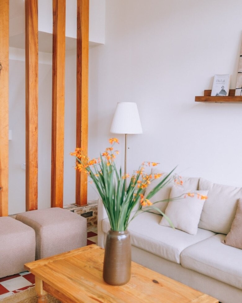 Không gian trong nhà sử dụng các gam màu nhẹ nhàng như trắng, kem, nâu nhạt – tạo cảm giác sạch sẽ, dễ chịu và rộng thoáng.