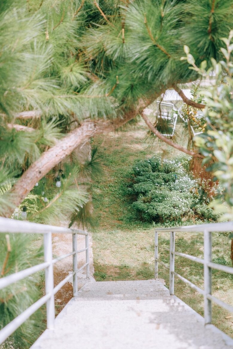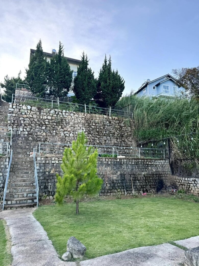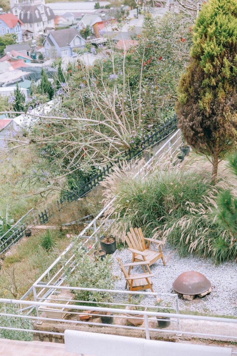Nhìn từ trên cao, sân vườn được chia nhiều tầng bằng tường đá, bao quanh là hàng thông thẳng tắp. Một góc nhỏ được đặt ghế ngồi và hố đốt lửa vào những đêm se lạnh.