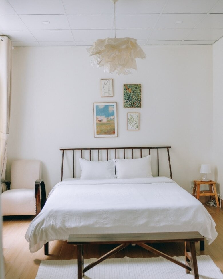 Các căn phòng ngủ thường được bài trí tối giản, ngập ánh sáng tự nhiên, giường gỗ cùng bộ drap trắng tinh khôi, tạo cảm giác nhẹ nhàng, thư thái.