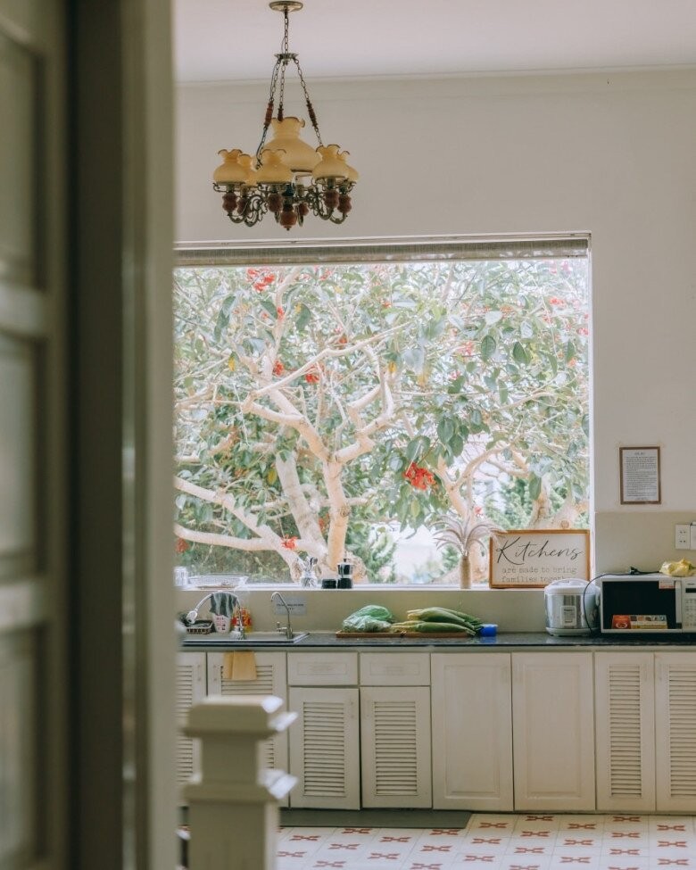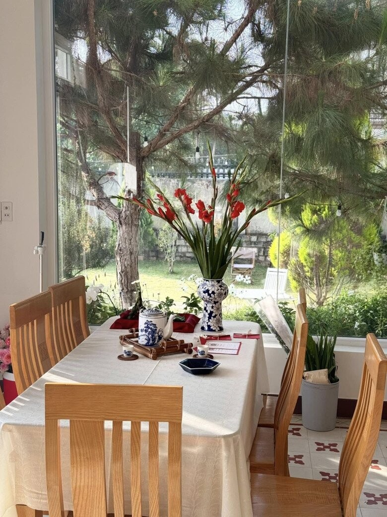 Cửa sổ bếp hướng vườn. Khu vực ăn uống gọn gàng với bàn gỗ và bình hoa lớn, ngay cạnh ô cửa kính rộng nhìn ra vườn thông, mang cảm giác như đang dùng bữa giữa thiên nhiên.