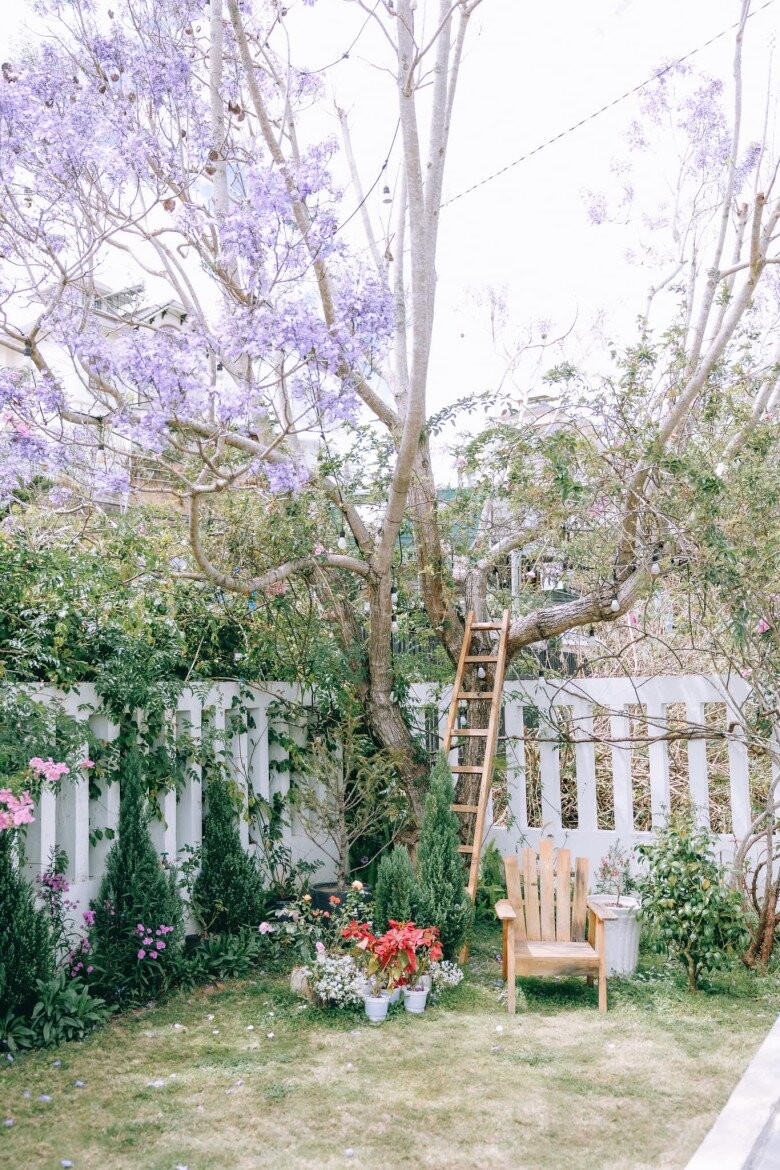 Góc chill dưới gốc cây với chiếc ghế gỗ đặt ngay dưới tán cây lớn, xung quanh là chậu hoa nhỏ, thảm cỏ xanh và thang gỗ tựa vào thân cây – một không gian đầy chất thơ.