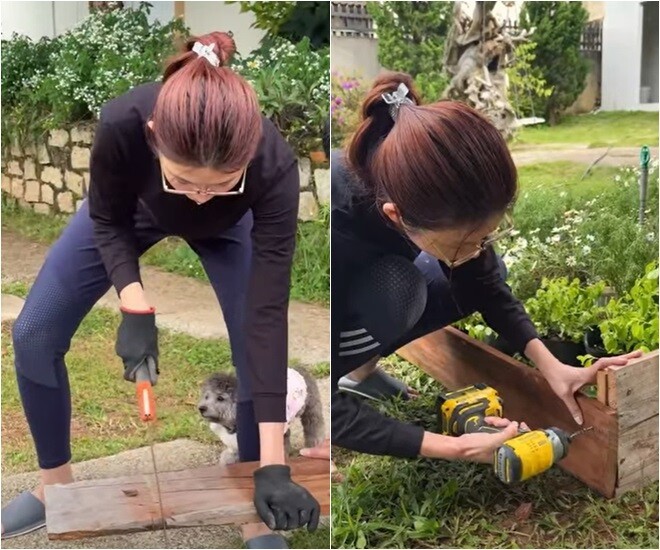 Nàng hậu còn cầm cưa, đóng đinh để làm viền gỗ bao quanh ô hoa. Cô cho biết: "Trước giờ ở chỗ này là ba mẹ Châu sẽ trồng hoa trực tiếp xuống luôn. Rồi tới lần nào hoa tàn thì sẽ cắt đi, xong rồi nuôi lên lại. Nhưng chu kỳ để hoa mọc lên lại thì cũng tốn thời gian rất lâu. Nhiều khi mọi người tới lại không chụp hình được hoa tươi, hoa đẹp".