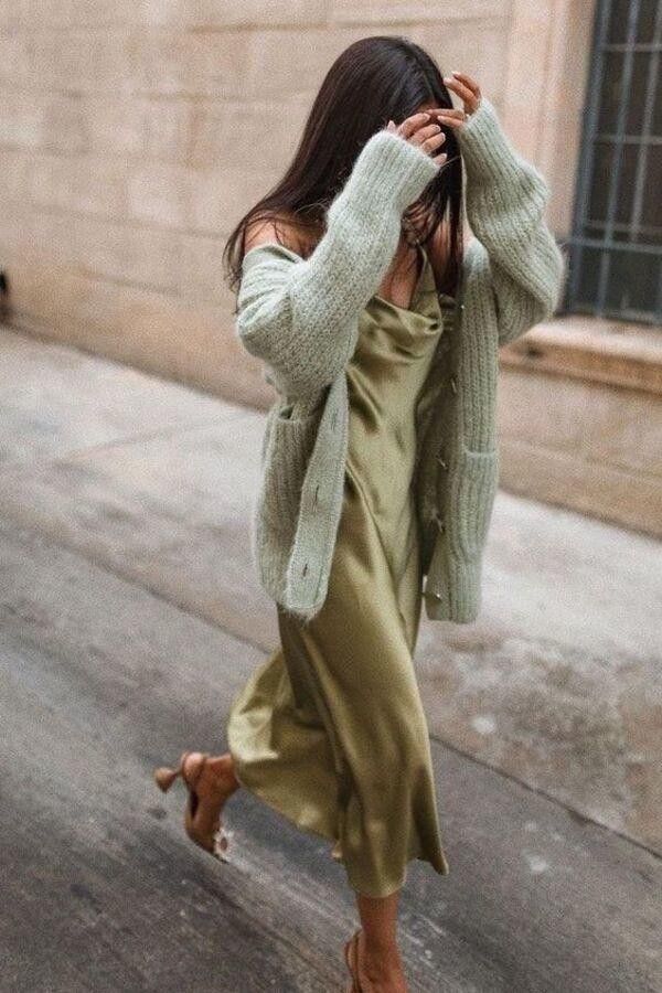 Nhắc tới thời trang Pháp thì không thể không liệt kê những chiếc áo khoác cardigan, vừa dễ mix đồ vừa phù hợp với đa số kiểu váy vóc, trong đó có slip dress. Set đồ màu pastel dễ dàng biến nàng trở nên nữ tính trong gang tấc, diện vào là thích mê.