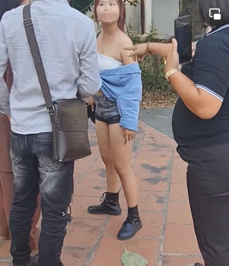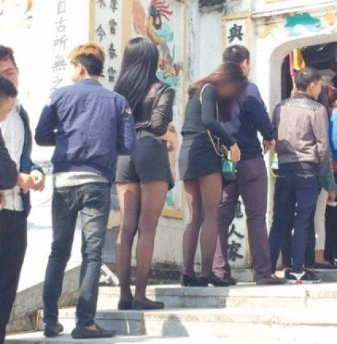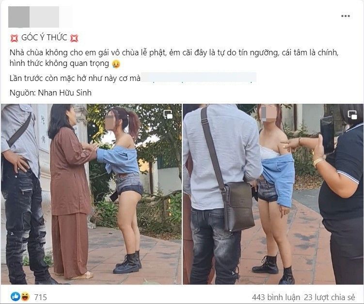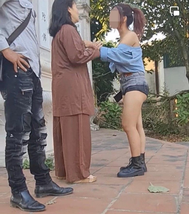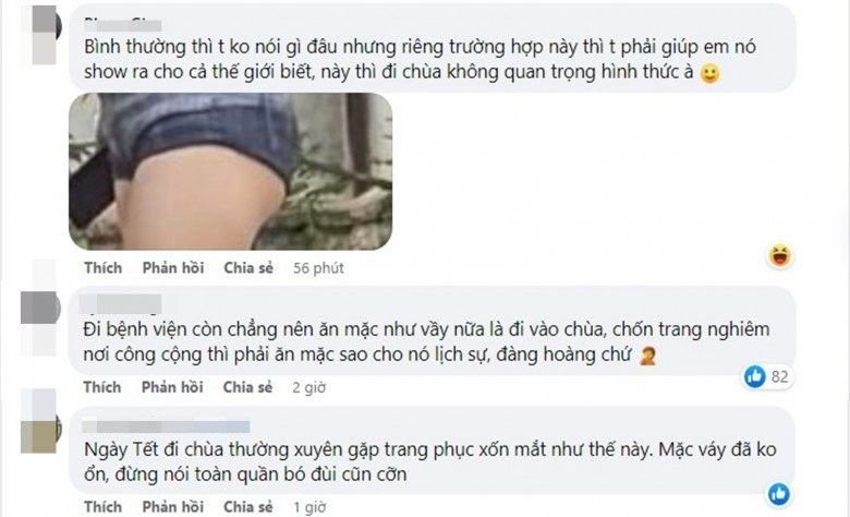 Theo chủ bài đăng đăng tải, cô nàng này đã bị một Phật tử của nhà chùa từ chối cho vào cúng lễ. Không cần mô tả quá nhiều cũng có thể thấy, trang phục của cô có phần không phù hợp với chốn linh thiêng trong khi những người xung quanh đều mặc quần phủ dài chấm gót chân và áo dài tay.