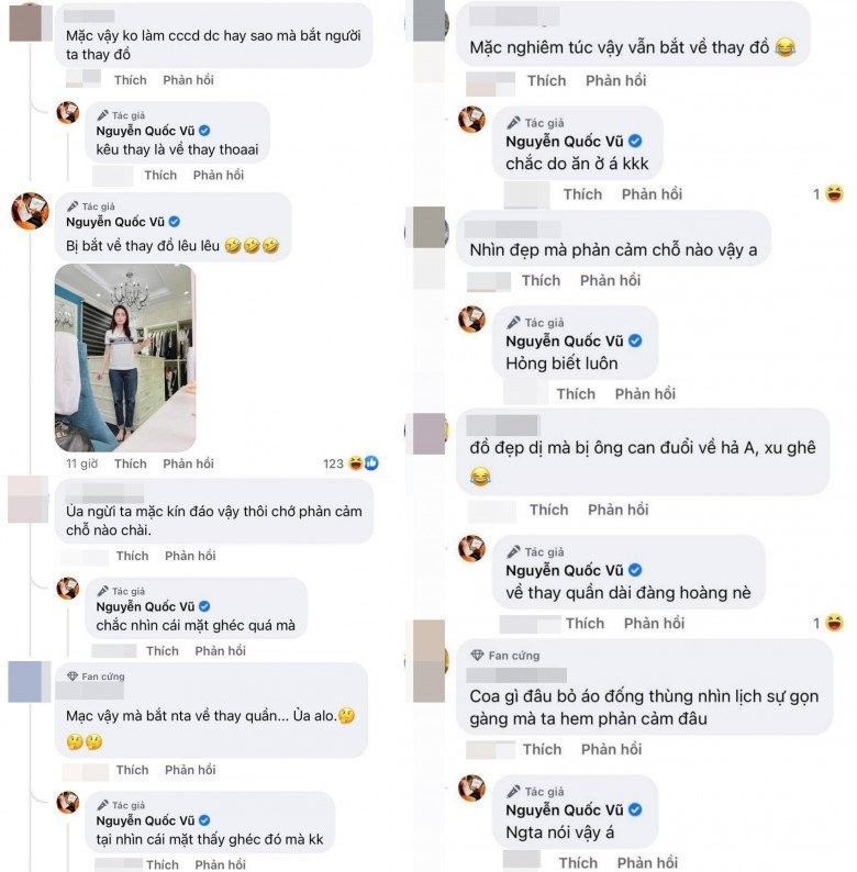 "Có bạn nhắn tin hỏi anh thấy sao mà để vợ chụp hình vậy đăng lên. Anh thấy đẹp, hỏi miết cha" - Nguyễn Quốc Vũ thẳng thắn đáp trả. Bài đăng của "ông xã quốc dân" thu về hàng nghìn bình luận cùng hàng chục lượt chia sẻ cổ vũ từ CĐM.