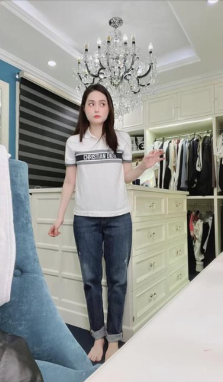 Thực tế, người đẹp chọn mặc chiếc áo polo (áo phông có cổ) tới từ thương hiệu Dior đắt đỏ và mix cùng chân váy. Song có thể vì lí do nào đó mà cô nàng đã không qua được cửa để vào thực hiện chụp ảnh. Người đẹp liền tuân thủ và về nhà mặc chiếc quần dài kín chân để thực hiện nghiêm chỉnh trách nhiệm của một công dân.