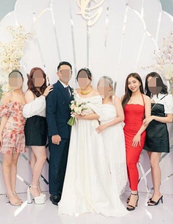 Cụ thể, Nhật Lê sử dụng mẫu váy hai dây dáng ôm, có tông đỏ rực rỡ. Nhờ váy áo nổi bật, cô thành công thu hút mọi ánh nhìn trong khung ảnh chụp cùng tân nương.