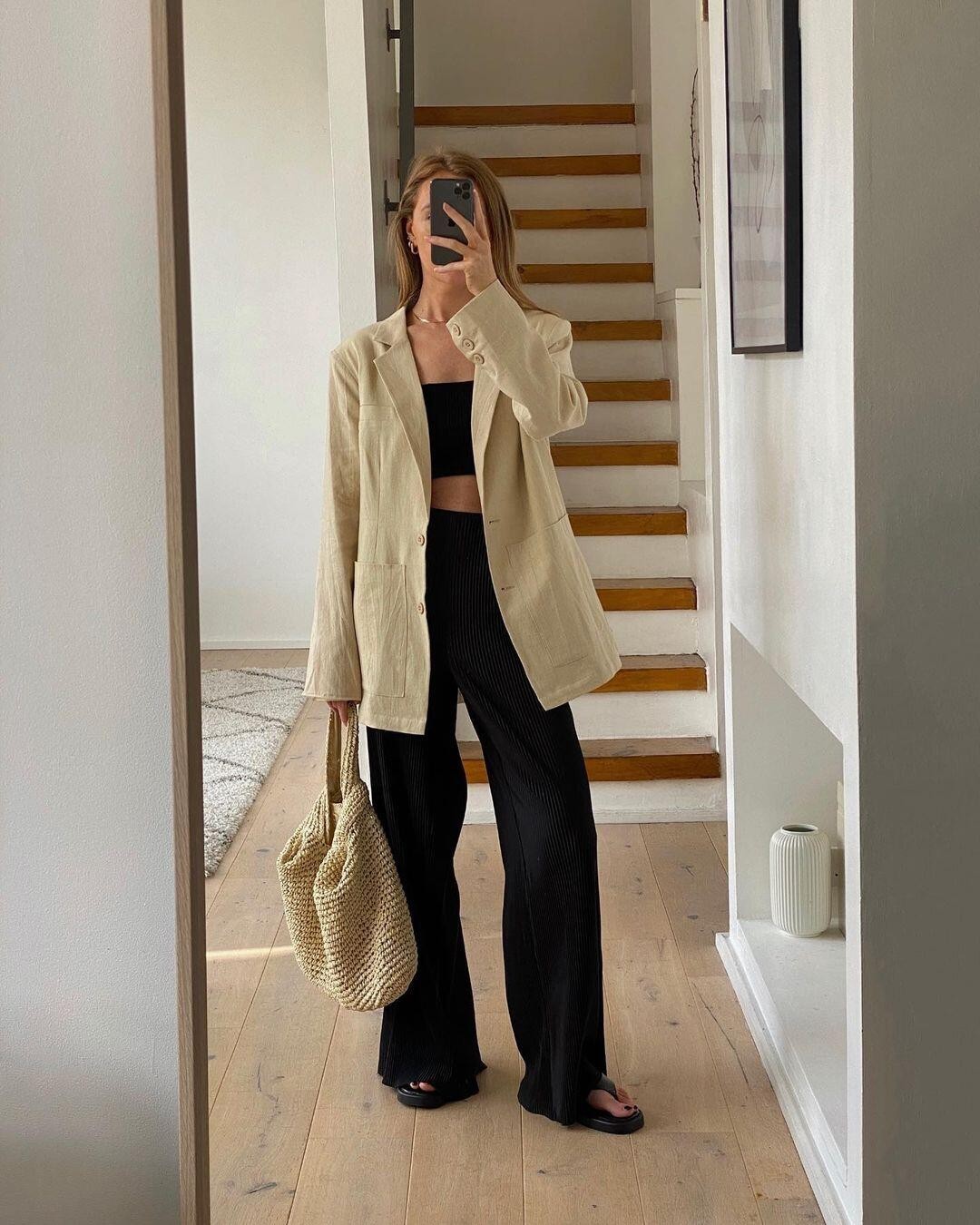 Blazer kết hợp với quần ống rộng là một trong những công thức phối đồ được nhiều phụ nữ công sở yêu thích. Sự kết hợp này mang lại vẻ ngoài chỉn chu, hiện đại mà vẫn rất thoải mái khi di chuyển.