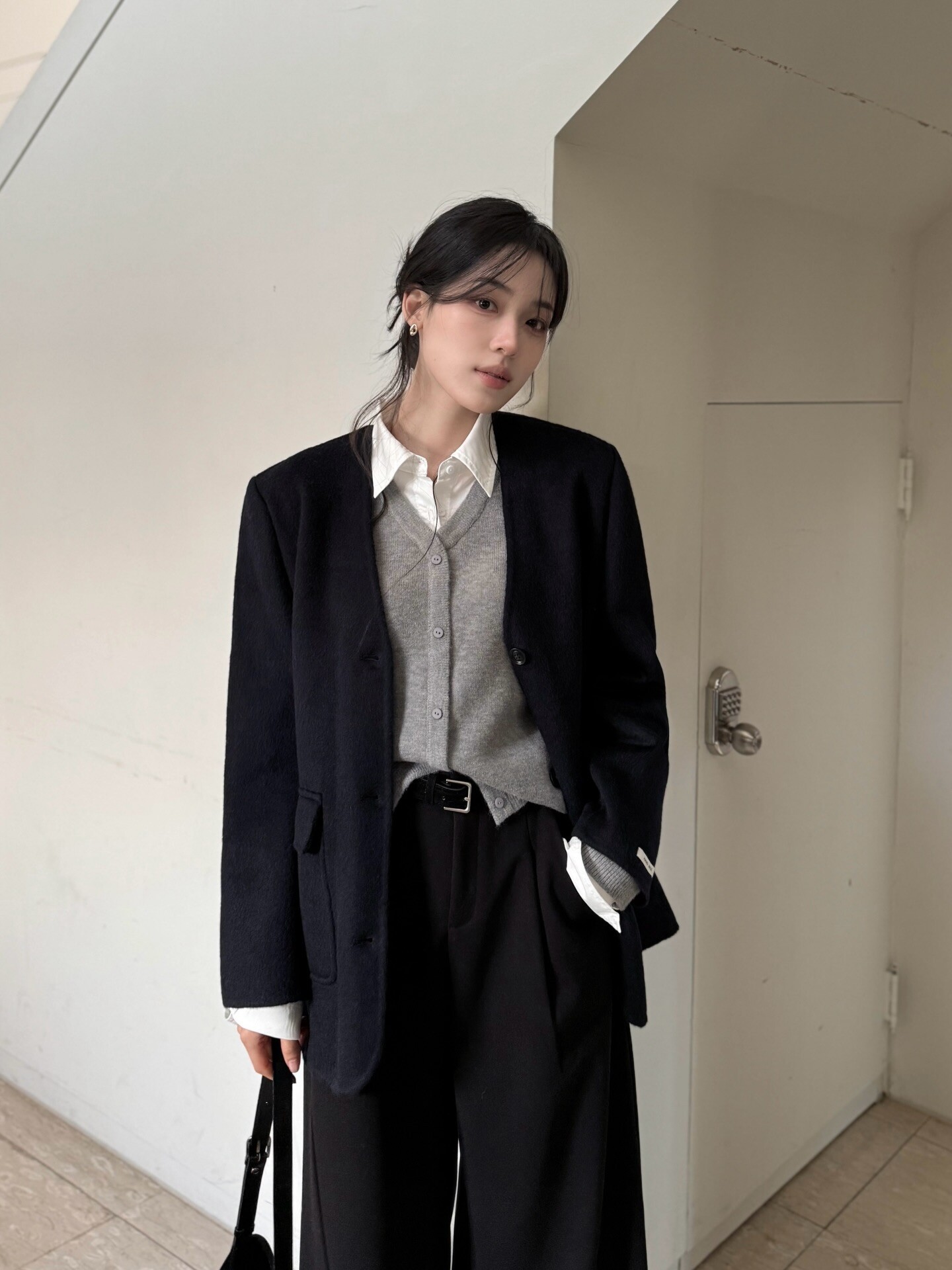 Quần ống rộng giúp che khuyết điểm phần đùi và bắp chân, đồng thời tạo cảm giác vóc dáng cao ráo hơn, đặc biệt khi chọn thiết kế cạp cao. Trong khi đó, áo blazer giúp tổng thể trang phục trở nên gọn gàng và chuyên nghiệp.