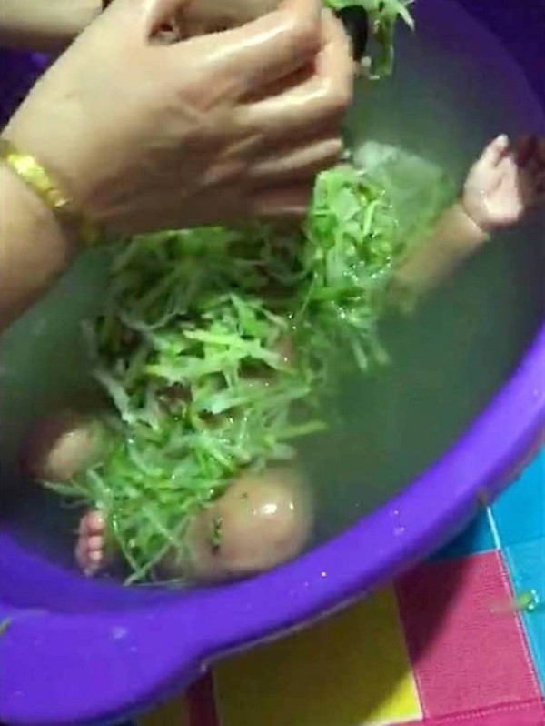 Hôm đó, khi trở về nhà, cô nhìn thấy mẹ chồng đang tắm cho con trong phòng. Cảnh tượng trước mắt khiến cô tá hoả. Cậu con trai sơ sinh của cô nằm trong chậu tắm, toàn thân được phủ đầy dưa chuột thái sợi. Để dưa chuột phát huy hiệu quả, bà còn ngâm cháu trong nước một khoảng thời gian lâu hơn bình thường. Người mẹ hoảng loạn, nhanh chóng bế con rồi tráng lại cho bé bằng nước ấm rồi đưa đứa trẻ ra ngoài, mặc quần áo cho con.