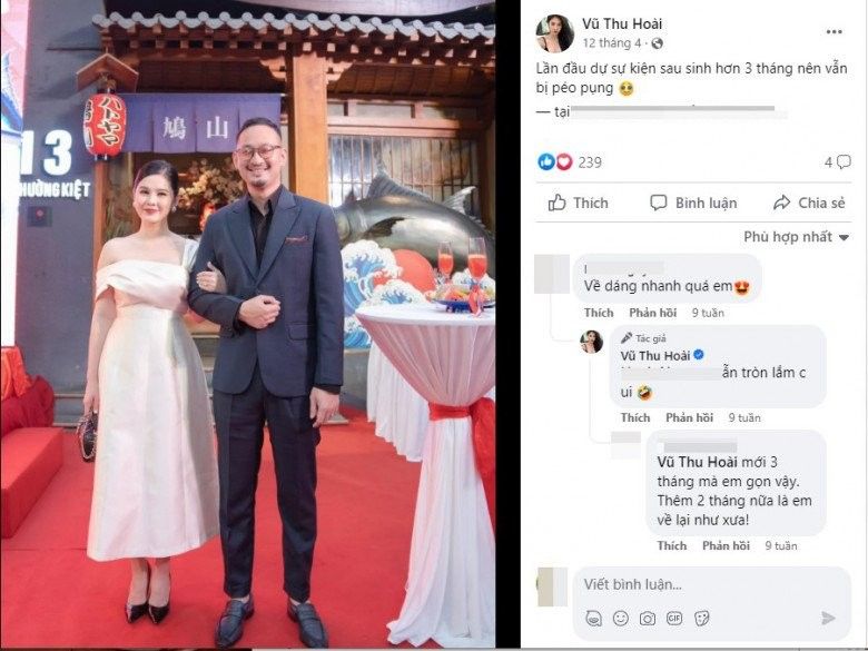 Sau sinh hơn 3 tháng, cô đã sửa soạn cho mình 1 diện mạo gọn gàng xuất hiện trong 1 sự kiện cùng ông xã. Bên dưới tấm hình, nữ MC được khen về dáng nhanh. Một tài khoản trầm trồ: "Mới 3 tháng mà em gọn vậy. Thêm 2 tháng nữa là em về lại như xưa".