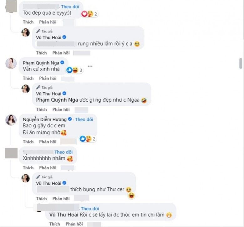 Vũ Thu Hoài liên tục bày tỏ mong ước có được chiếc bụng thon thả, khô mỡ sau sinh như "cá sấu chúa" Quỳnh Nga. Một số chị em lại xuýt xoa, mẹ bỉm có mái tóc rất đẹp.