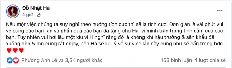 Trong khi "cơn bão" phẫn nộ vẫn chưa dịu xuống, Đỗ Nhật Hà đã lên tiếng và đăng tải lên trang cá nhân. Cô cho rằng đơn giản đó chỉ là vài phút vui vẻ cùng fan và phần quà fan chuẩn bị. Cô trân trọng tình cảm của fan. Người đẹp chuyển giới nhấn mạnh việc sẽ lưu ý về sự việc lần này và cẩn trọng hơn trong những sự kiện khác.
