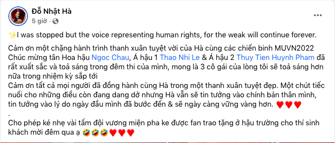 "Hôm nay tưởng như một đêm vui trọn vẹn vậy mà lại không phải vậy. Thực sự rất buồn khi trang phục mình mặc khi thử và nhìn ở ánh sáng tự nhiên bình thường đều rất đẹp và kín đáo. Vậy mà dưới ánh đèn flash, cơ thể của mình lại bị lộ ở những điểm nhạy cảm. Mặc dù đã mặc quần màu da đến ngang eo, và sử dụng 2 lớp miếng dán ngực nhưng thật không ngờ ánh đèn flash lại khiến lớp áo dường như có cảm giác xuyên thấu.