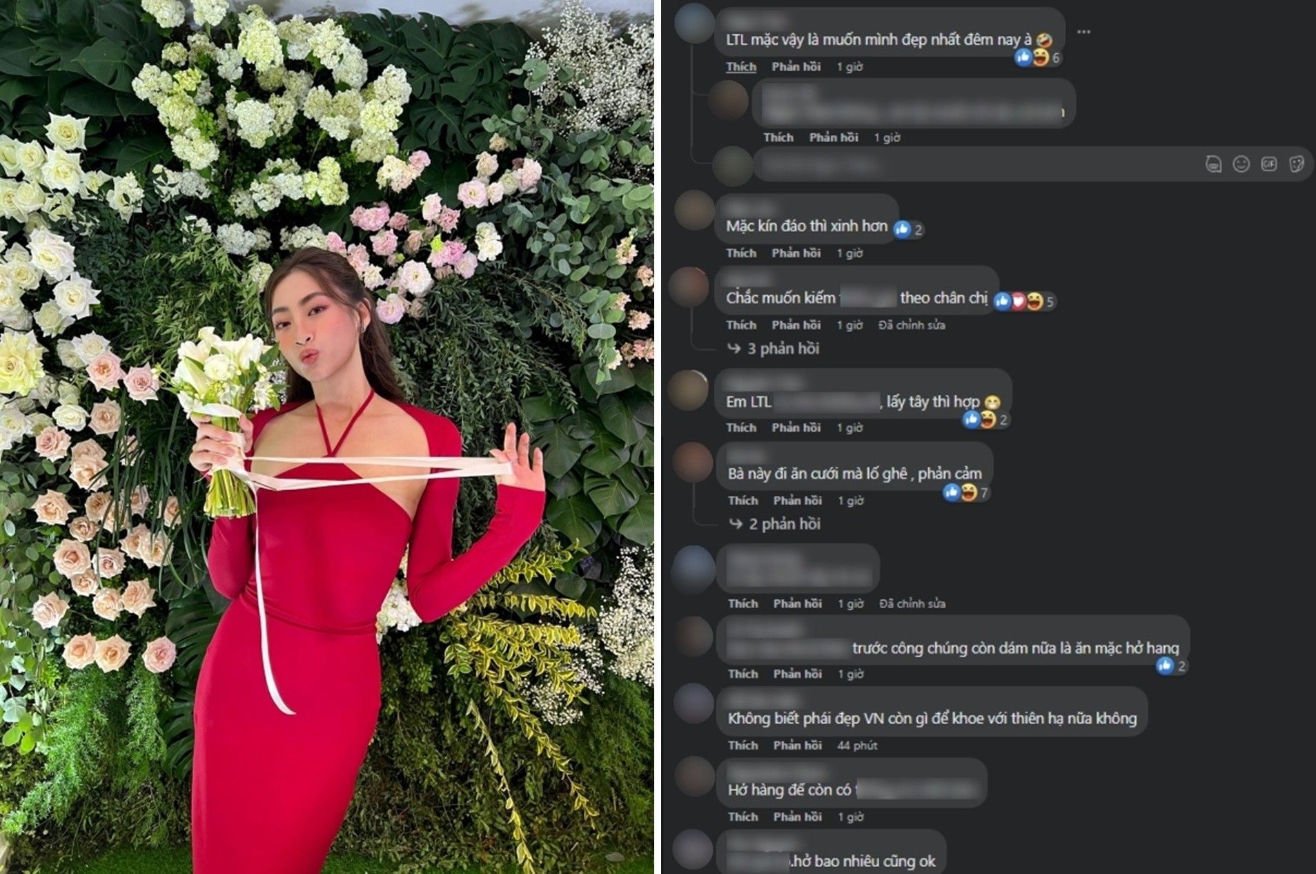 Không những diện trang phục táo bạo trong buổi tiệc, Lương Thùy Linh còn chuẩn bị một thiết kế khác để thay trong đám cưới của Đỗ Mỹ Linh. Trên trang Facebook cá nhân, nàng hậu sinh năm 2000 đăng tải hình ảnh diện chiếc váy đỏ nổi bật, khoe vai và xương quai xanh quyến rũ.