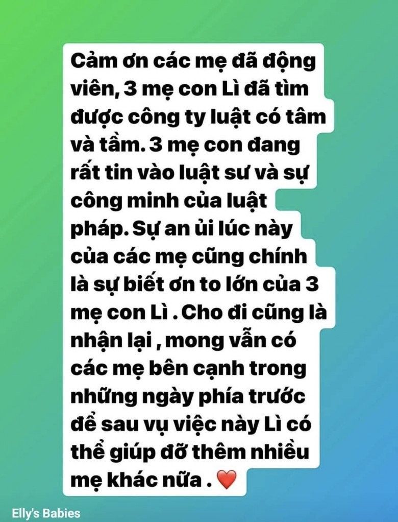 Elly Trần chia sẻ: "Cảm ơn các mẹ đã động viên, 3 mẹ con Lì (Elly) đã tìm được công ty luật có tâm và tầm. 3 mẹ con đang rất tin vào luật sư và sự công minh của luật pháp. Sự an ủi lúc này của các mẹ cũng chính là sự biết ơn to lớn của 3 mẹ con Lì".