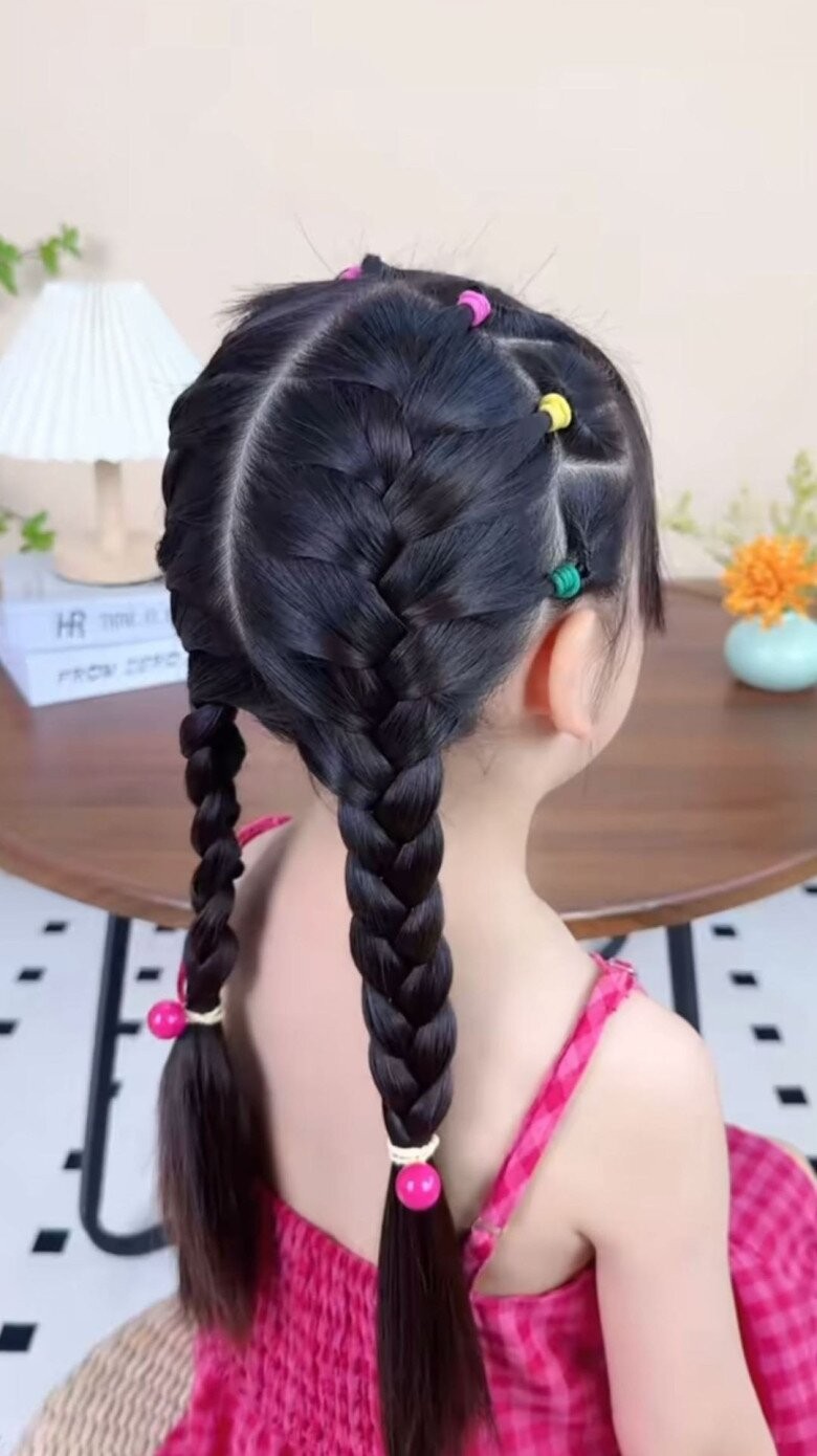 Trước khi tết tóc đuổi, mẹ thắt từng bím nhỏ ở quanh đầu là tạo được kiểu tóc này.