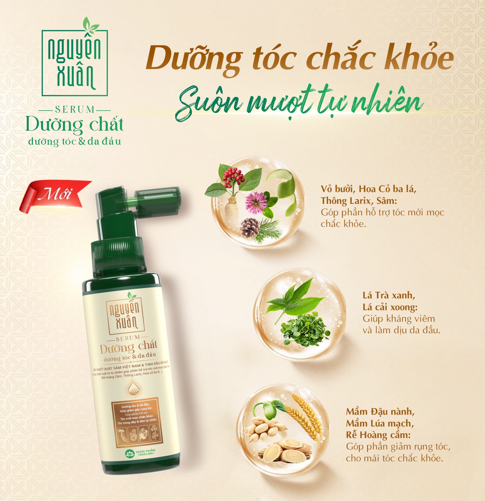 Serum dưỡng chất dưỡng tóc và da đầu Nguyên Xuân là thành quả của hành trình nghiên cứu bền bỉ từ Trung tâm Dược mỹ phẩm Hoa Linh. Sản phẩm kế thừa bí quyết dưỡng tóc từ dược liệu cổ truyền phương Đông, kết hợp cùng công nghệ hiện đại để phát triển giải pháp chuyên biệt cho mái tóc và da đầu phụ nữ Việt Nam. Đây là sự hòa quyện giữa tinh hoa dược liệu thiên nhiên và thành tựu khoa học, mang đến công dụng giúp dưỡng tóc và da đầu, giúp chân tóc chắc khoẻ, góp phần giảm tóc gãy rụng, giúp tóc trông dày và đen hơn. Trong mỗi giọt serum là sự chắt lọc của nhiều thành phần tốt cho tóc và da đầu như: