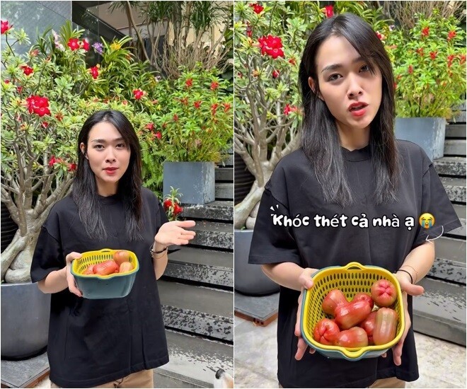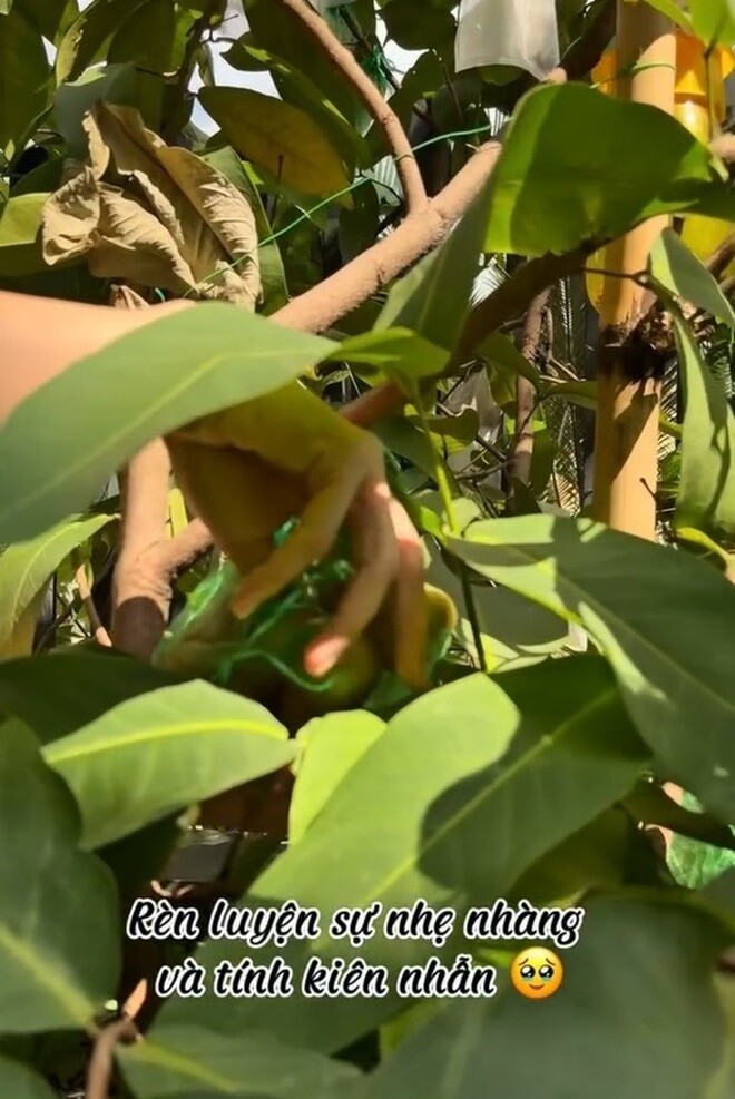 Dù các trái được bọc túi rất cẩn thận nhưng vẫn bị rụng. "Cứ mỗi sáng ra là rụng một rổ, đau lòng quá đi", nữ diễn viên buồn bã nói.