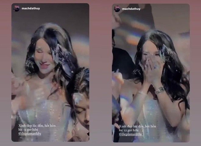 Trước khoảnh khắc này, bạn Diệp Lâm Anh hóm hỉnh viết: "Xinh đẹp lúc đến, hết hồn lúc 12 giờ hihi".
