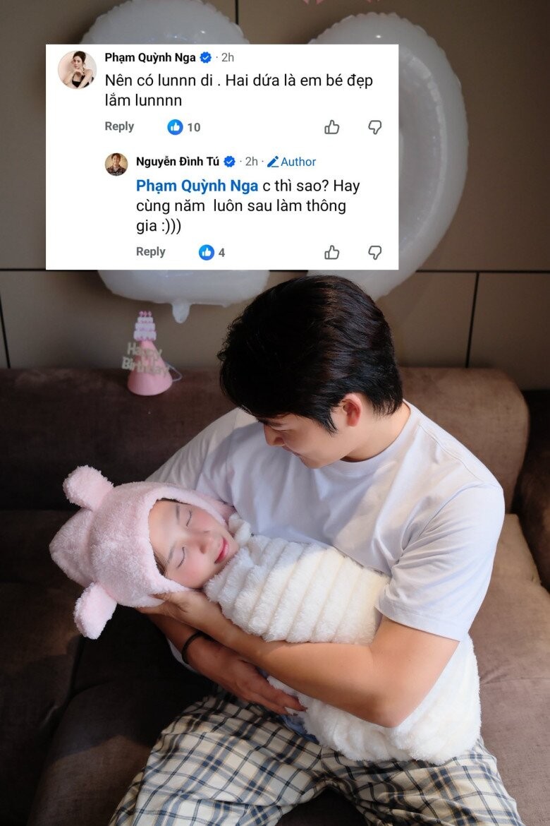 Thay vì những câu ngôn tình lãng mạn hay những bó hoa hồng rực rỡ thường thấy của các cặp đôi mới cưới, Đình Tú lại đăng tải bức ảnh bế một em bé mới sinh, nhưng điều đáng nói là khuôn mặt em bé lại được photoshop một cách khéo léo thành gương mặt của... Ngọc Huyền. Đi kèm với tấm hình "dìm hàng" không thương tiếc này là dòng trạng thái đầy tính cà khịa: "'Em bé này lạ lắm'. Chúc em bé sơ sinh nhưng khuôn mặt hơi phụ huynh ngày được sinh ra đời thật nhiều quà và bánh. Chúc em bé hay ăn chóng lớn và cái miệng xinh bớt cãi".