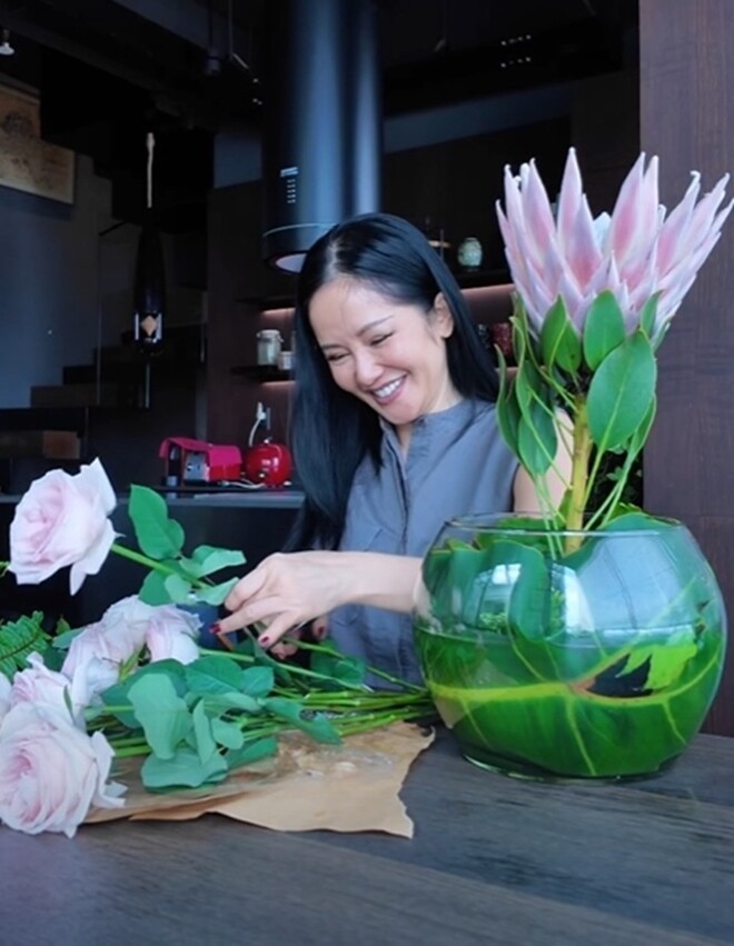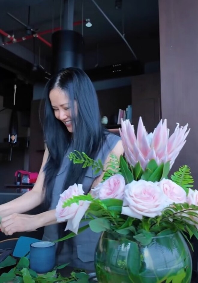 Khoảnh khắc nhẹ nhàng trong căn bếp, nơi Hồng Nhung biến hoa lá thành liệu pháp chữa lành. Cô tâm sự: “Một trong những cách thư giãn vô cùng hiệu quả cho phụ nữ đó là cắm hoa”.