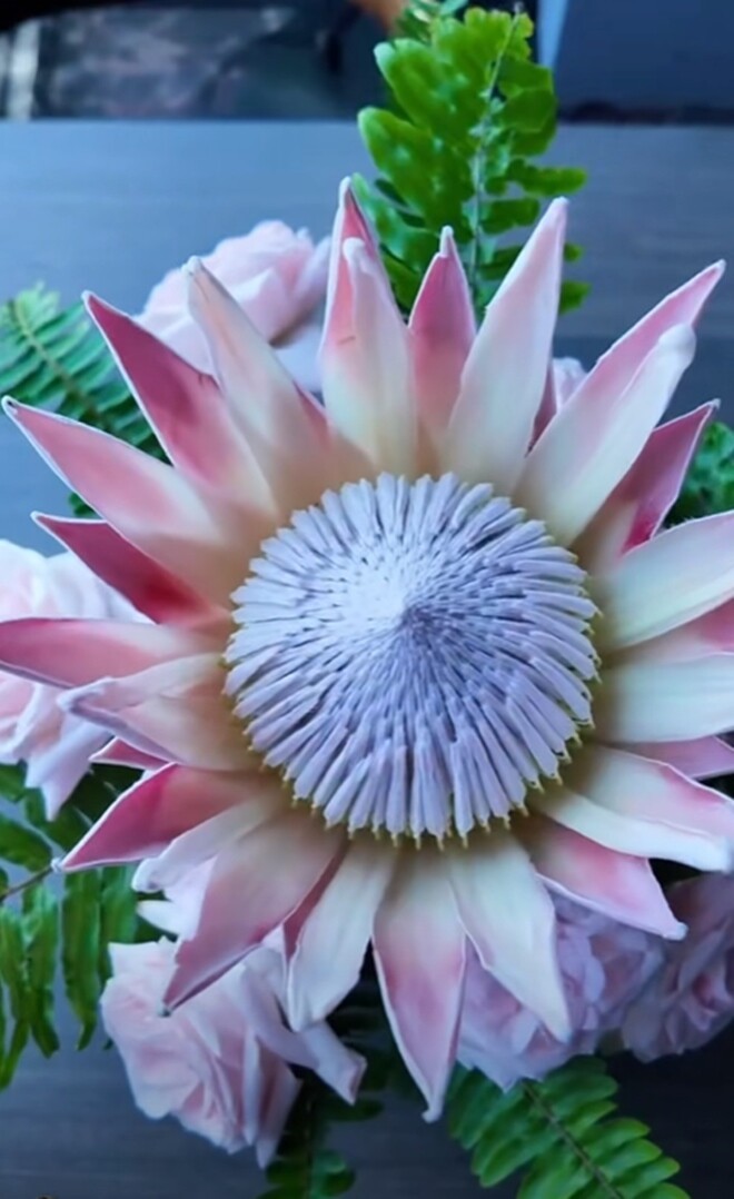 Diva dí dỏm: "Đố cả nhà biết hoa gì?" Đây chính là hoa Thảo đường Hoàng đế, tên khoa học là Protea cynaroides, còn được gọi là King Protea - loại quốc hoa của Nam Phi. Hoa có kích thước lớn, đường kính có thể lên đến 30cm, cánh hoa nhọn vươn thẳng, bao quanh phần nhụy tròn như một vương miện. Loài hoa này thường xuất hiện trong các thiết kế hoa nghệ thuật vì vẻ ngoài độc đáo và sức sống bền bỉ, có thể tươi rất lâu sau khi cắt.