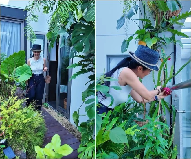 Khu vườn xinh xắn của Hồng Nhung với một số loài hoa. Cô tâm sự: “Đúng thật là những việc làm vườn rồi cứ được tiếp xúc với cây cỏ là thấy trong lòng bỗng bình yên”.