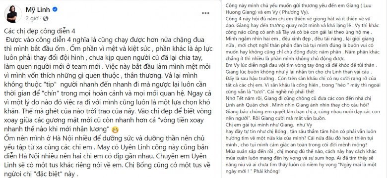 Mới đây trên trang cá nhân, diva Mỹ Linh vừa đăng tải bài viết trải lòng sau khi tham gia chương trình Chị đẹp đạp gió rẽ sóng. Trong bài viết, cô nhắc đến nhiều "chị đẹp" khác như Uyên Linh, Hồng Nhung, Phương Vy.