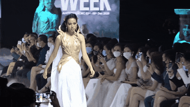 Trở về sau cuộc thi quốc tế và vừa hết Covid nhưng cô đã rất thần thái và tràn đầy năng lượng với sự xuất hiện trong chiếc váy rất sang tại show mở màn Sa Vũ của NTK Lê Thanh Hoà.