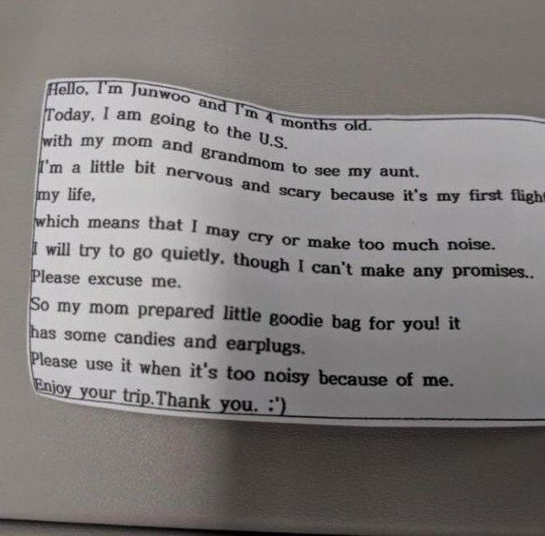 Đây là lần đầu tiên con đi máy bay, con hơi hồi hộp và sợ nên có thể con sẽ khóc hay gây ồn ào. Con không dám hứa nhưng con sẽ cố gắng giữ yên lặng. Mọi người đừng giận con nhé! Mẹ con gửi mọi người ít kẹo và đồ bịt tai, nếu con ồn quá mọi người dùng bịt tai ạ! Con cảm ơn, chúc mọi người chuyến bay tốt lành!". Khi nhận được món quà và lời nhắn chân thành như thế, có lẽ ai nấy đều vui lòng bỏ qua nếu em bé chẳng may quấy khóc.