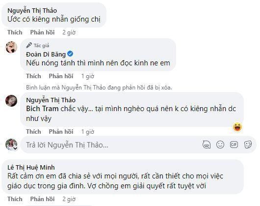 Bên cạnh đó, cách giải quyết nhẹ nhàng, không la mắng con của vợ chồng Đoàn Di Băng cũng được chú ý. Bà mẹ không vì xót số tiền 100 triệu đồng mà la mắng hoặc đánh con gái, cô đã phân tích, giảng giải rất nhẹ nhàng để con gái hiểu và không mắc sai phạm tiếp theo. "Cô rất thích cách dạy con của Băng dù con có lỗi nhưng vẫn để con thấy dược lỗi của con và càng làm cho con gần gũi với mẹ hơn"; "Cách xử lý khéo léo quá, rất hay và ý nghĩa. Mong rằng các bậc phụ huynh cũng có thể kiềm chế được cảm xúc, giữ bình tĩnh không đánh mắng con như Đoàn Di Băng...". Tuy nhiên cũng có người cho rằng do gia đình Đoàn Di Băng có điều kiện về kinh tế nên mới có thể kiên nhẫn và nhẹ nhàng như bà mẹ, các gia đình khác nghèo nên sẽ có hành xử không thể bình tĩnh.