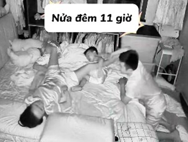 Theo đó, clip ghi lại cảnh gia đình gồm cặp vợ chồng và hai cậu con trai chừng 4-5 tuổi ngủ chung trong một phòng. Lúc đó khoảng 11h đêm, người chồng nằm phía dưới sàn nhà còn vợ đang cho 2 con trai ngủ.