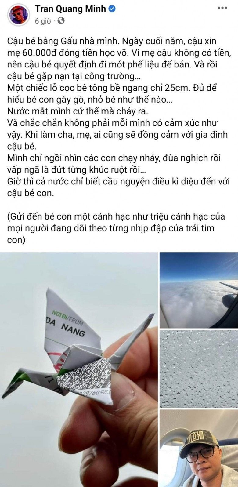 Trên trang cá nhân, BTV Trần Quang Minh viết: "Cậu bé bằng Gấu nhà mình. Ngày cuối năm, cậu xin mẹ 60.000đ đóng tiền học võ. Vì mẹ cậu không có tiền, nên cậu bé quyết định đi mót phế liệu để bán. Và rồi cậu bé gặp nạn tại công trường.