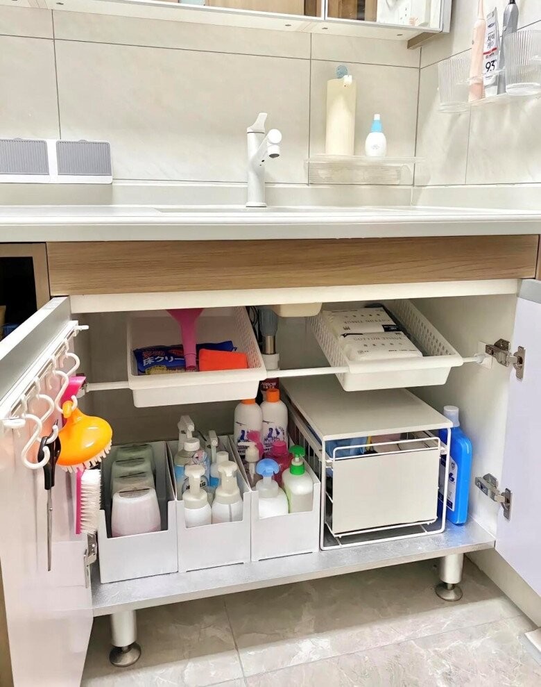 - Tận dụng không gian dưới bồn rửa: Đừng bỏ phí không gian này. Sử dụng hai thanh kéo để tạo ra một kệ nhỏ, đặt các hộp đựng đồ gọn gàng. Nhờ đó, không gian lưu trữ sẽ được tăng gấp đôi và mọi thứ sẽ được giấu kín, giúp phòng tắm luôn gọn gàng.