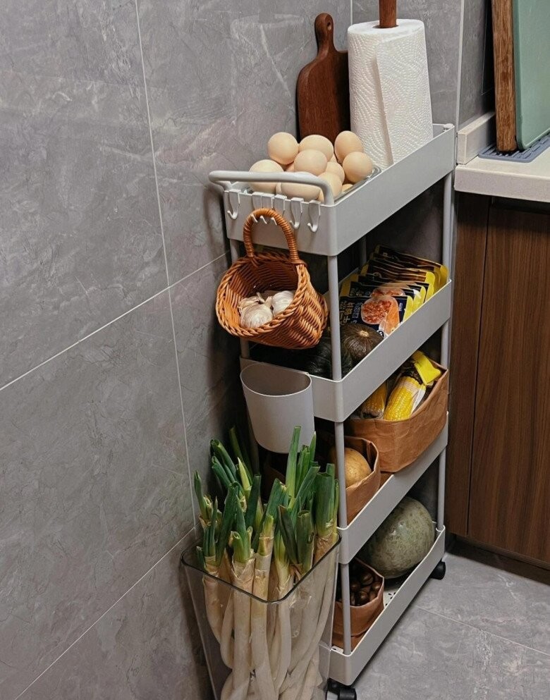 - Tránh để đồ trên sàn: Nhiều người có thói quen để thực phẩm như rau củ, gạo hay dầu ăn trên sàn. Điều này không chỉ làm không gian bếp trở nên chật chội mà còn gây mất mỹ quan. Thay vào đó, hãy sử dụng một chiếc xe đẩy nhỏ để chứa các loại rau củ không cần bảo quản trong tủ lạnh. Đối với gạo và dầu, hãy tận dụng các góc tủ để tiết kiệm không gian.