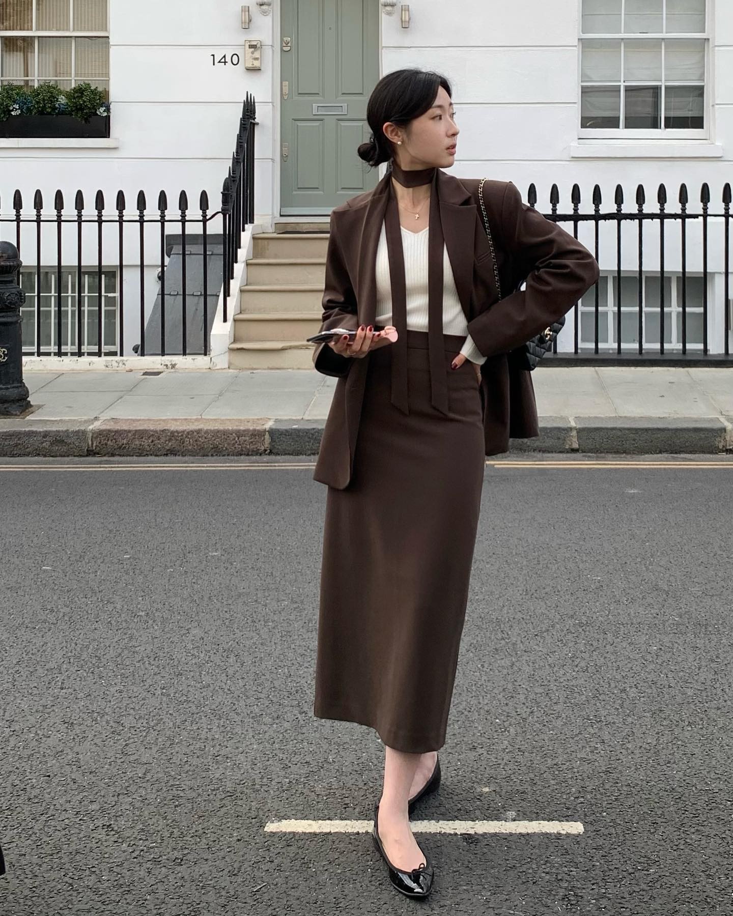 Những mẫu chân váy ngắn dài trên gối khoảng 5-7cm, dáng chữ A hoặc suông nhẹ là lựa chọn an toàn và dễ mặc. Khi kết hợp cùng áo sơ mi, áo len mỏng hoặc blazer, chân váy ngắn mang lại vẻ ngoài trẻ trung nhưng vẫn giữ được sự chỉn chu. Đây là kiểu váy phù hợp để tạo điểm nhấn cho phong cách, đặc biệt trong những dịp cần diện mạo năng động hơn.