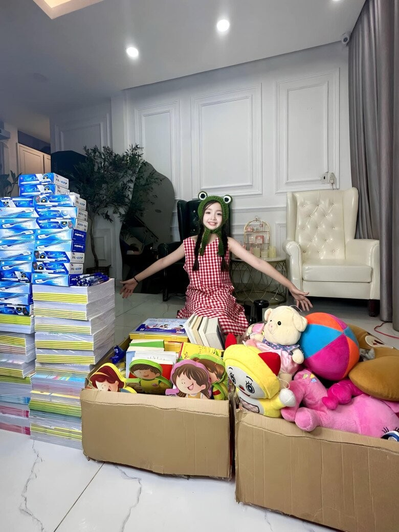 Bé Mộc Trà thích tham gia các hoạt động thiện nguyện giống mẹ.