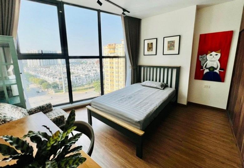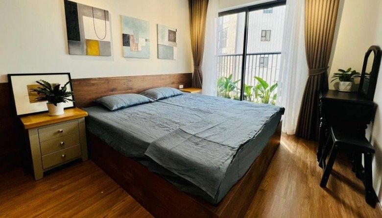 Sàn nhà và nội thất bằng gỗ, kết hợp với bức tường màu trắng và xanh lá cây, mang đến cảm giác ấm cúng.