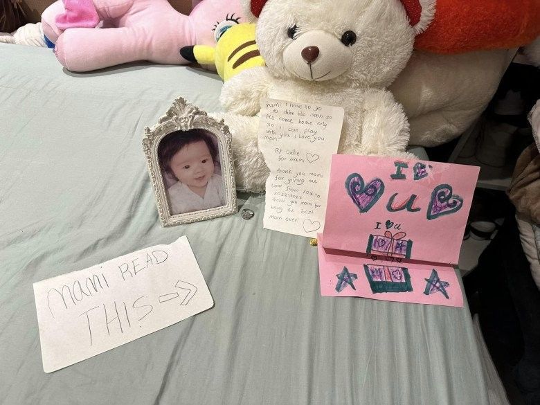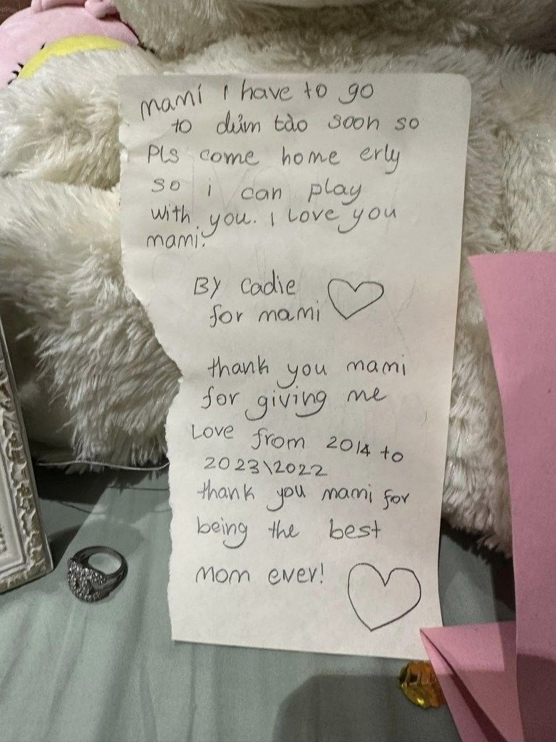 Nội dung bức thư của Cadie như sau: "Mẹ ơi! Con sắp phải đi Vũng Tàu rồi nên mẹ về nhà sớm được không? con sẽ được chơi cùng với mẹ. Con yêu mẹ. Cadie của mẹ. Cảm ơn mẹ về món quà mẹ đã dành cho con từ năm 2014 đến 2022-2023 (ý chỉ bức ảnh). Cảm ơn mẹ về những điều tốt đẹp nhất mẹ đã từng cho con".