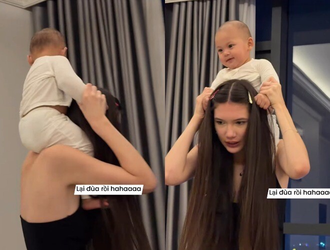 Trong video, Thanh Giang cưng chiều cháu trai, kiệu bé lên cổ rồi đi lại quanh nhà. Em gái Đặng Văn Lâm còn làm nhiều động tác đứng lên ngồi xuống khiến bé Gấu Lâm Minh thích thú cười típ mắt.