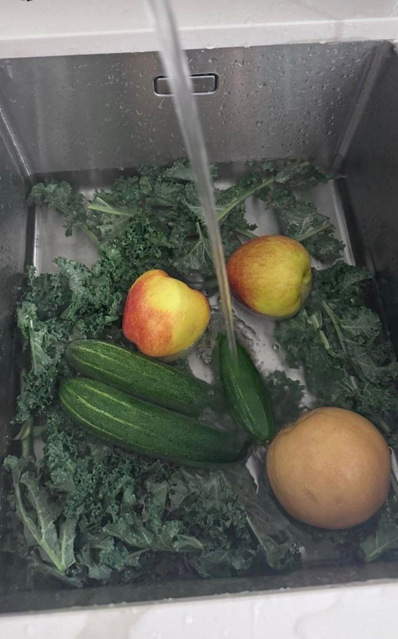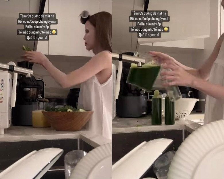 Cô làm nước ép và chia đều cẩn thận vào chai rồi bảo quản ngăn mát tủ lạnh. Nước ép là thức đồ dưỡng da, giữ dáng thích hợp bậc nhất đối với người bận rộn. Món đồ vừa cung cấp vitamin, chất xơ rất dịu dàng với hệ tiêu hóa. Giới nghệ sĩ thường đem theo người để nhâm nhi món đồ uống này để hạn chế việc ăn vặt lung tung.