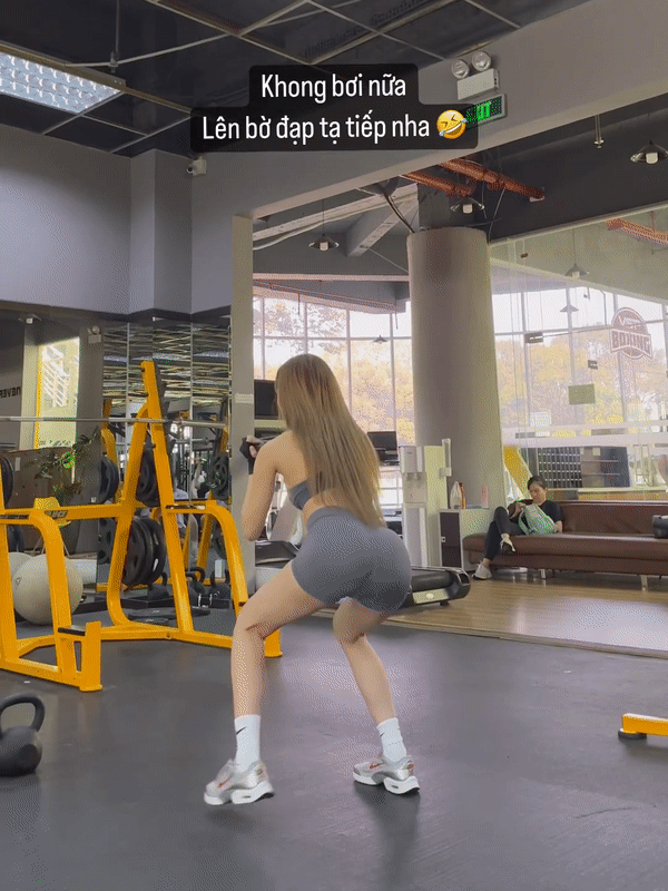 Cô đồng thời cũng hé lộ thêm bài tập giúp ăn vào mông và hạn chế vào đùi. Động tác goblet squat nhấc chân chéo lên phía trước này là động tác yêu thích của cả cô chị lẫn cô em quê Thanh Hóa.
