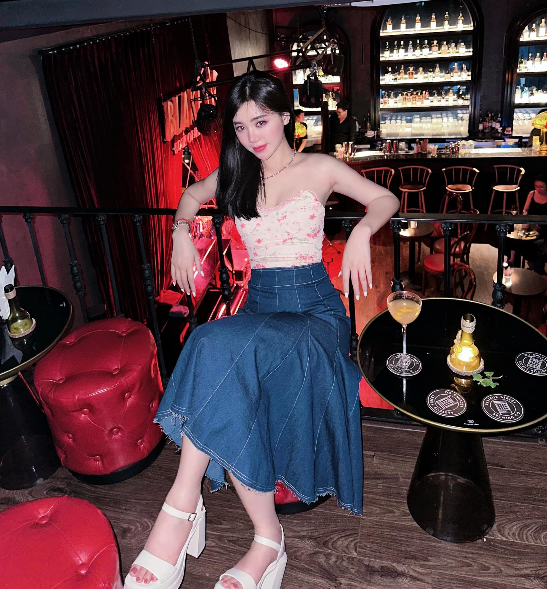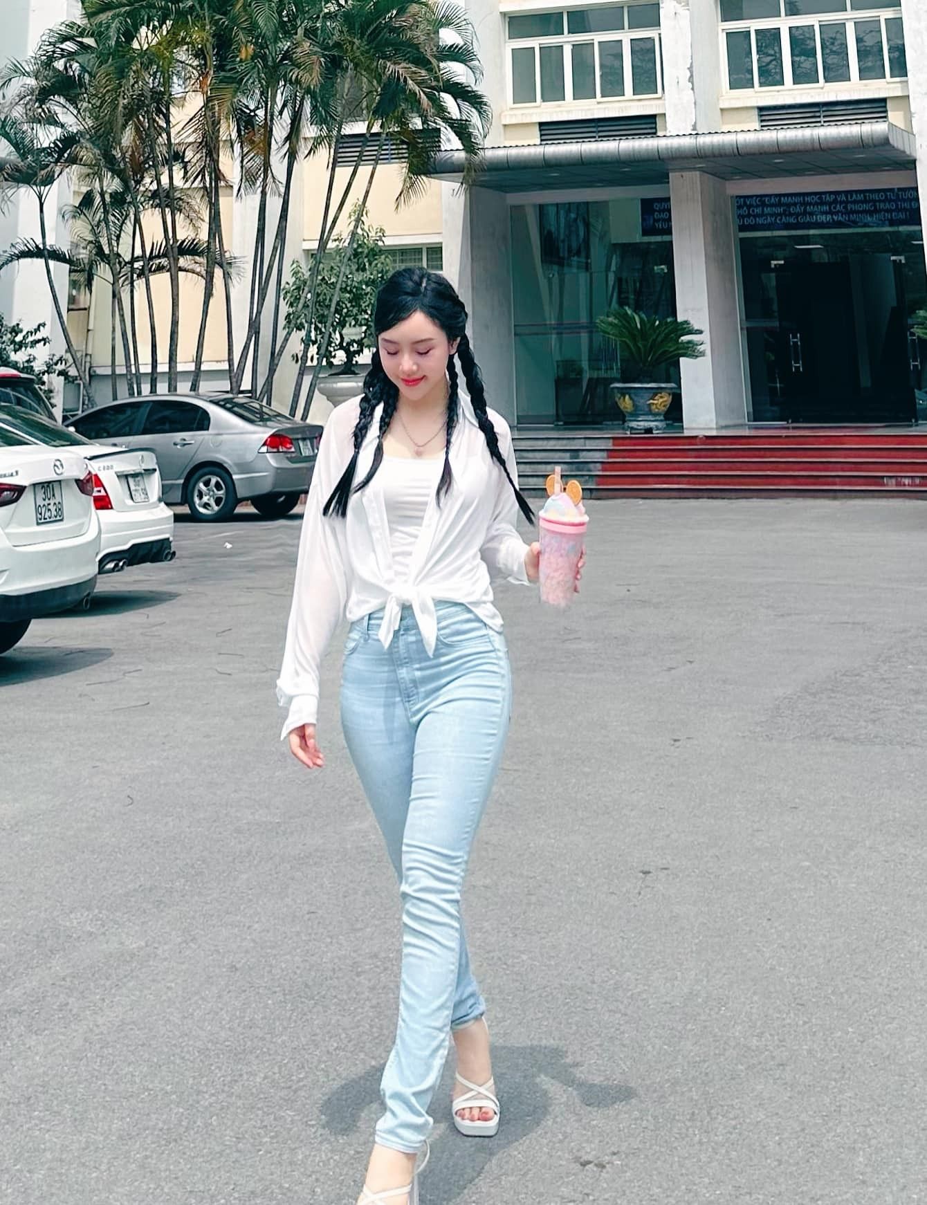 Quỳnh Kool hiếm khi mặc quần jeans bó sát vì đặc điểm cặp đùi lớn. Song nếu biết cách mix & match layering với áo trong áo ngoài thì cô vẫn rất gọn gàng, quyến rũ.